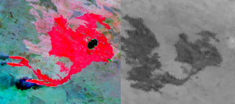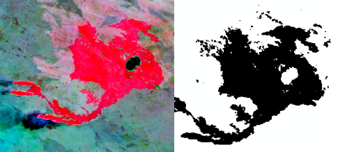 red on a Landsat image and the same burnt area mapped, with burnt shown as black and not burnt shown as white.